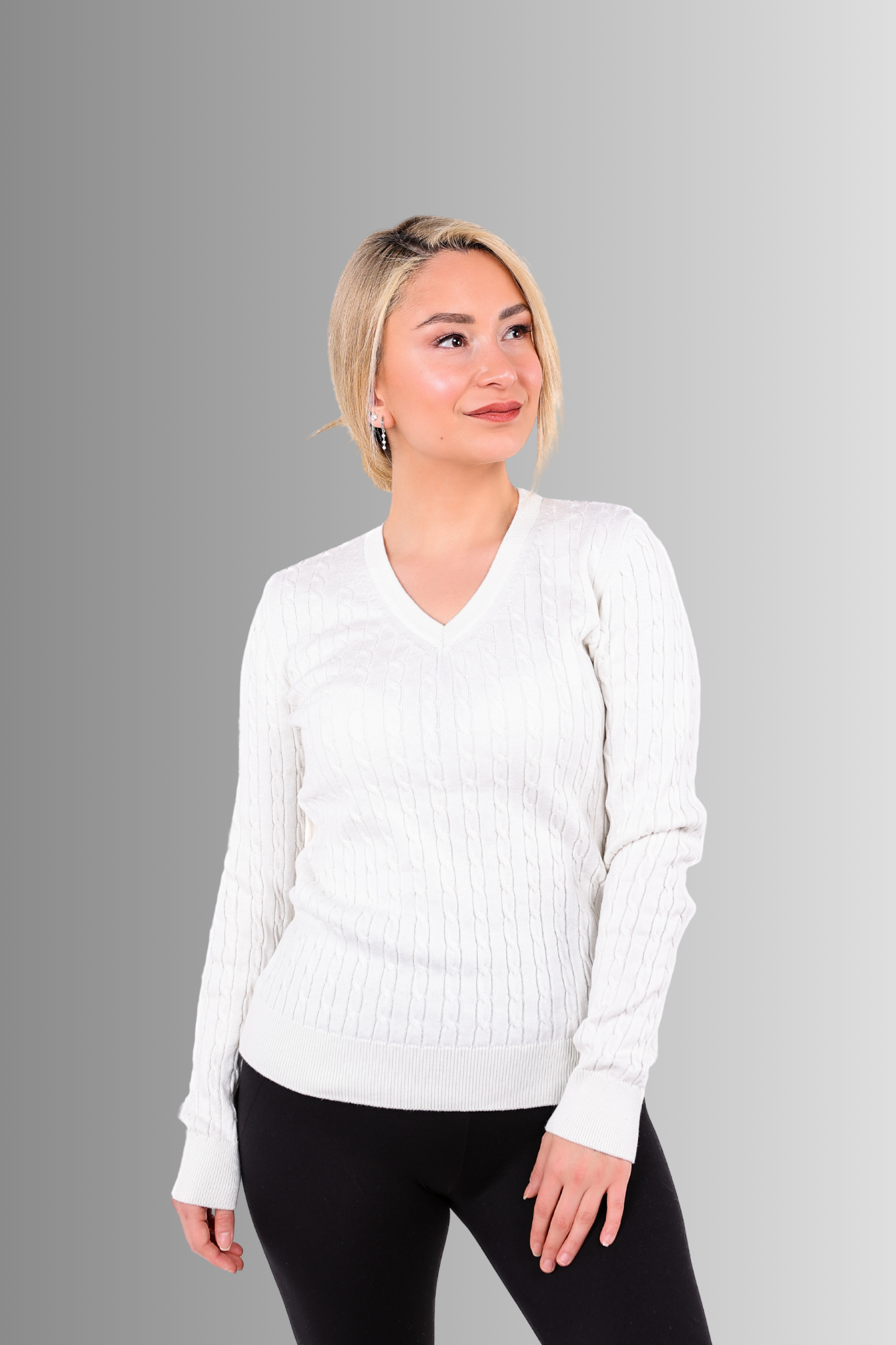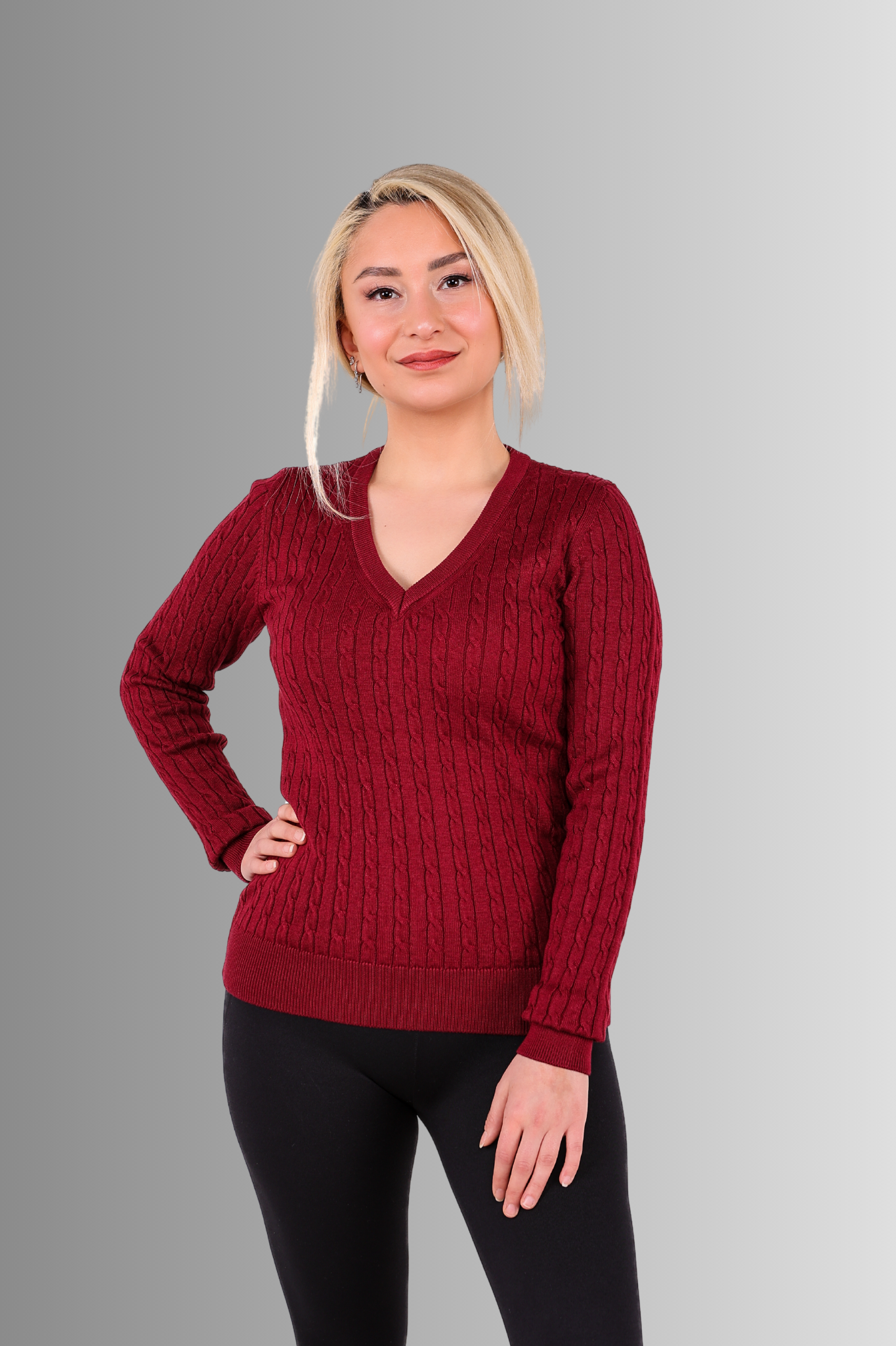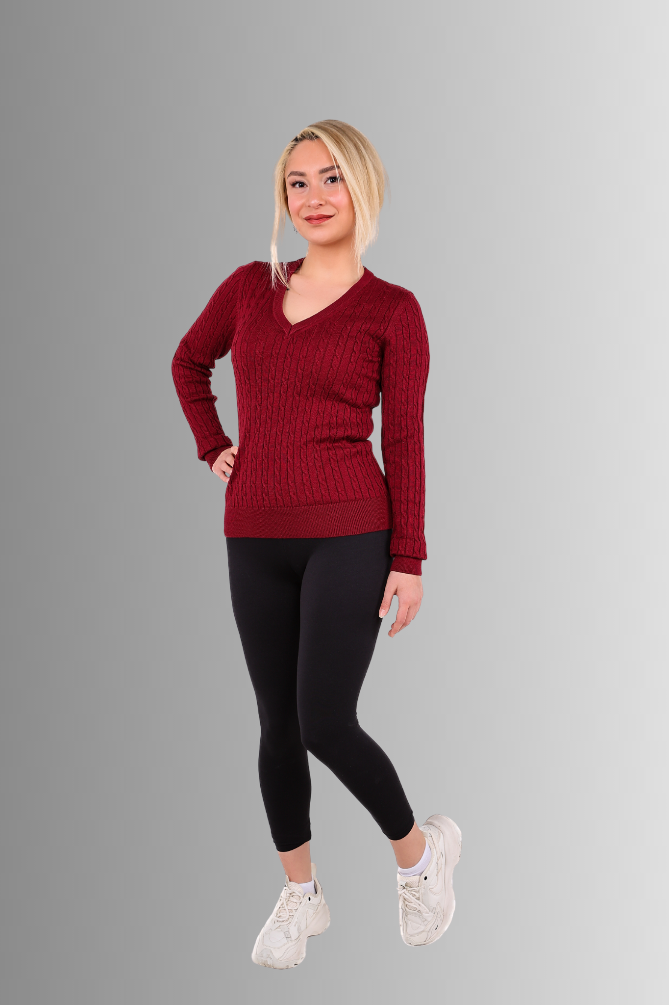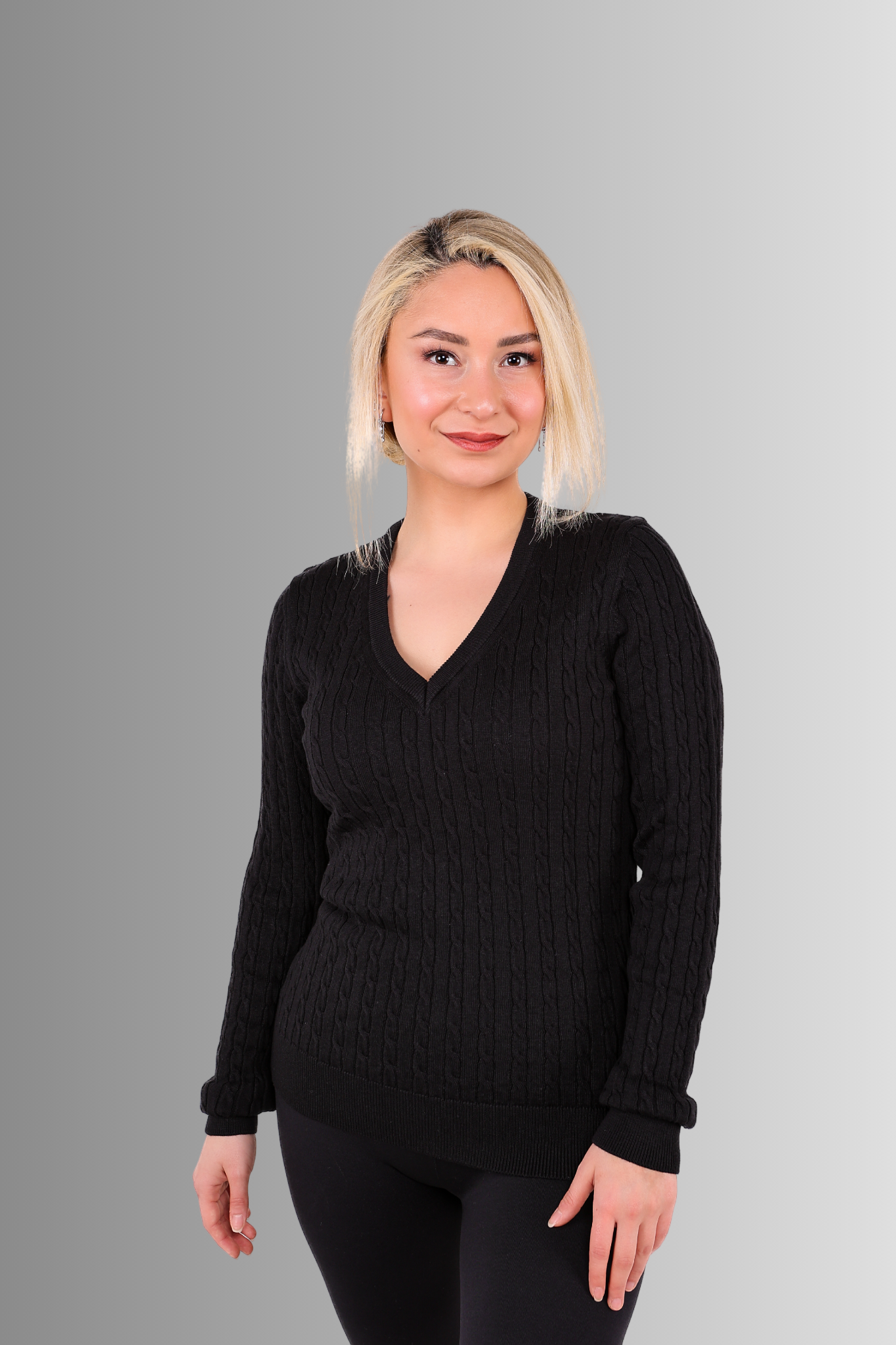 V yaka ve Saç Örgü detaylarının, kazağı hem gündelik hem de şık ortamlar için çok yönlü bir ürün haline getirdiğini onayladı.